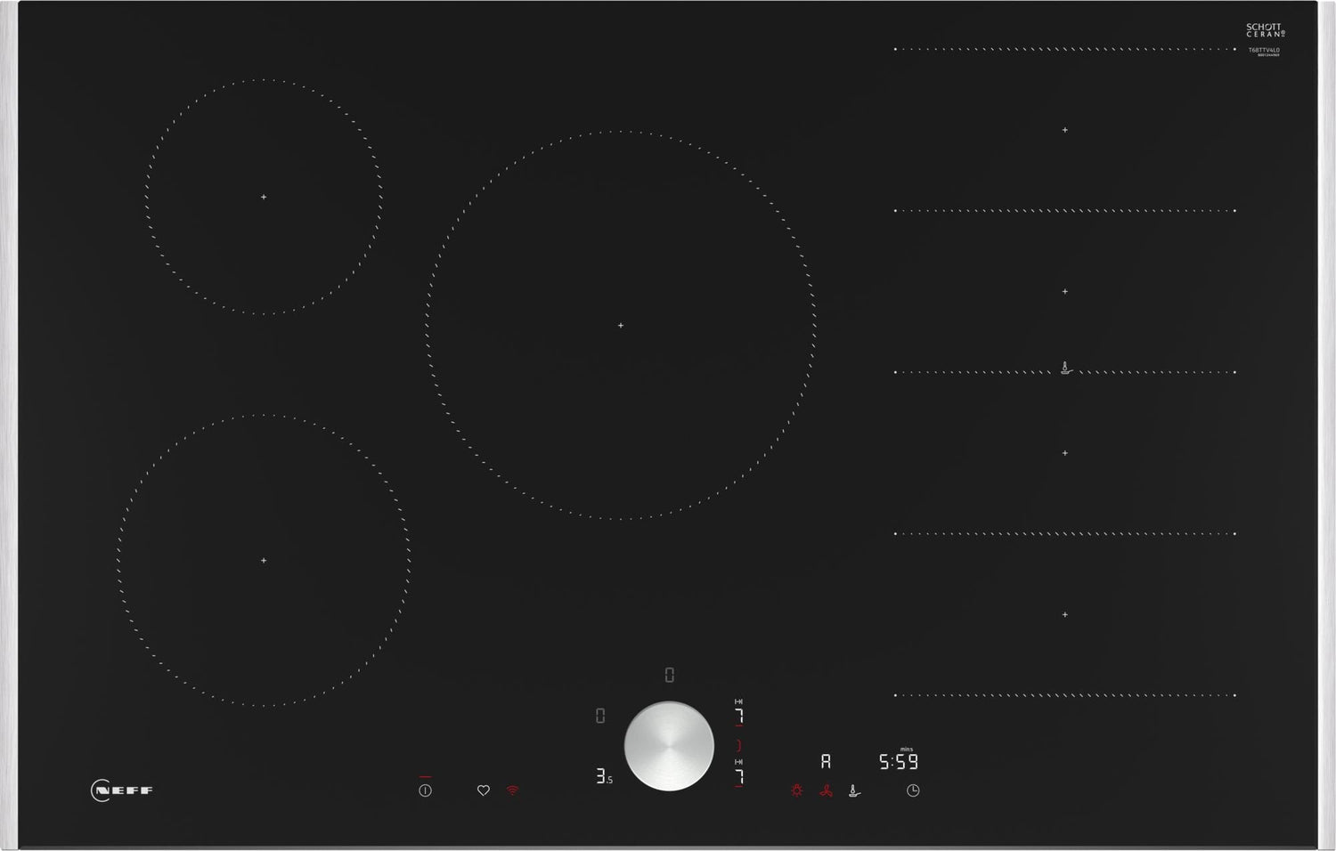 Neff N 90. Color del producto: Negro, Tipo de instalación: Integrado, Anchura de los quemadores: 80 cm. Tipo de control: Tocar, Control de posición: Frente, Tipo de reloj: Electrónico. Carga conectada (eléctrica): 7400 W, Voltaje de entrada AC: 220 - 240 V, Frecuencia de entrada AC: 50 - 60 Hz. Tecnologías NEFF (cocción): Home Connect, TwistPad®. Ancho: 830 mm, Profundidad: 527 mm, Altura: 51 mm