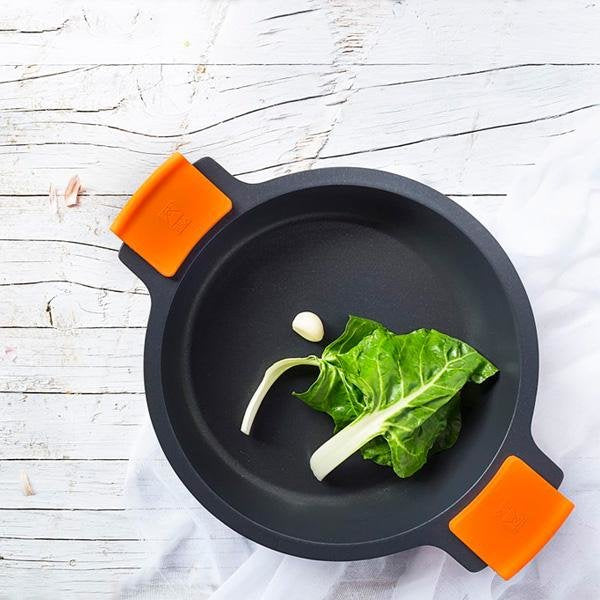 Incluye dos asas de silicona en color naranja para coger la olla con comodidad.
