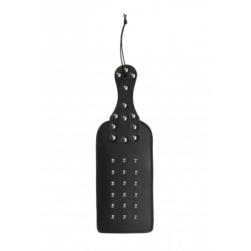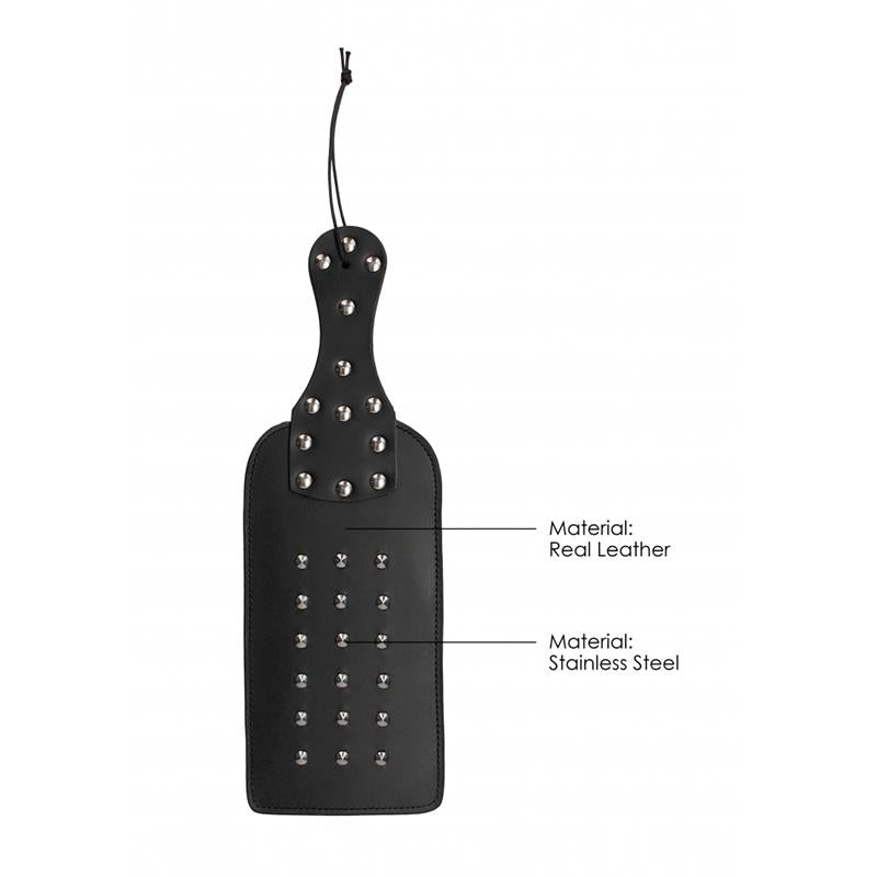 Extiende tu palma para que recibir unas cosquillas y unos pinchazos con esta pala con tacos elaborada con cuero. La pala cuenta con tacos, un asa ergonómica y un lazo de cuero para la muñeca para darte un perfecto agarre con cada movimiento. Un diseño de 18 topes cubre un lado mientras que el otro es suave y liso.