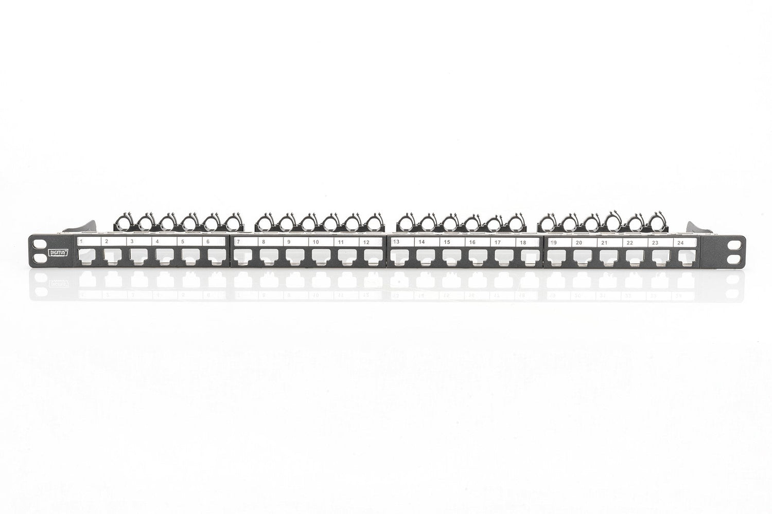 El panel de conexiones DIGITUS® de 24 puertos y 0,5U le ofrece una alta densidad de empaquetado. Como el panel sólo tiene 0,5U de altura, se pueden instalar 48 puertos (2 paneles con 24 puertos cada uno) en 1U.