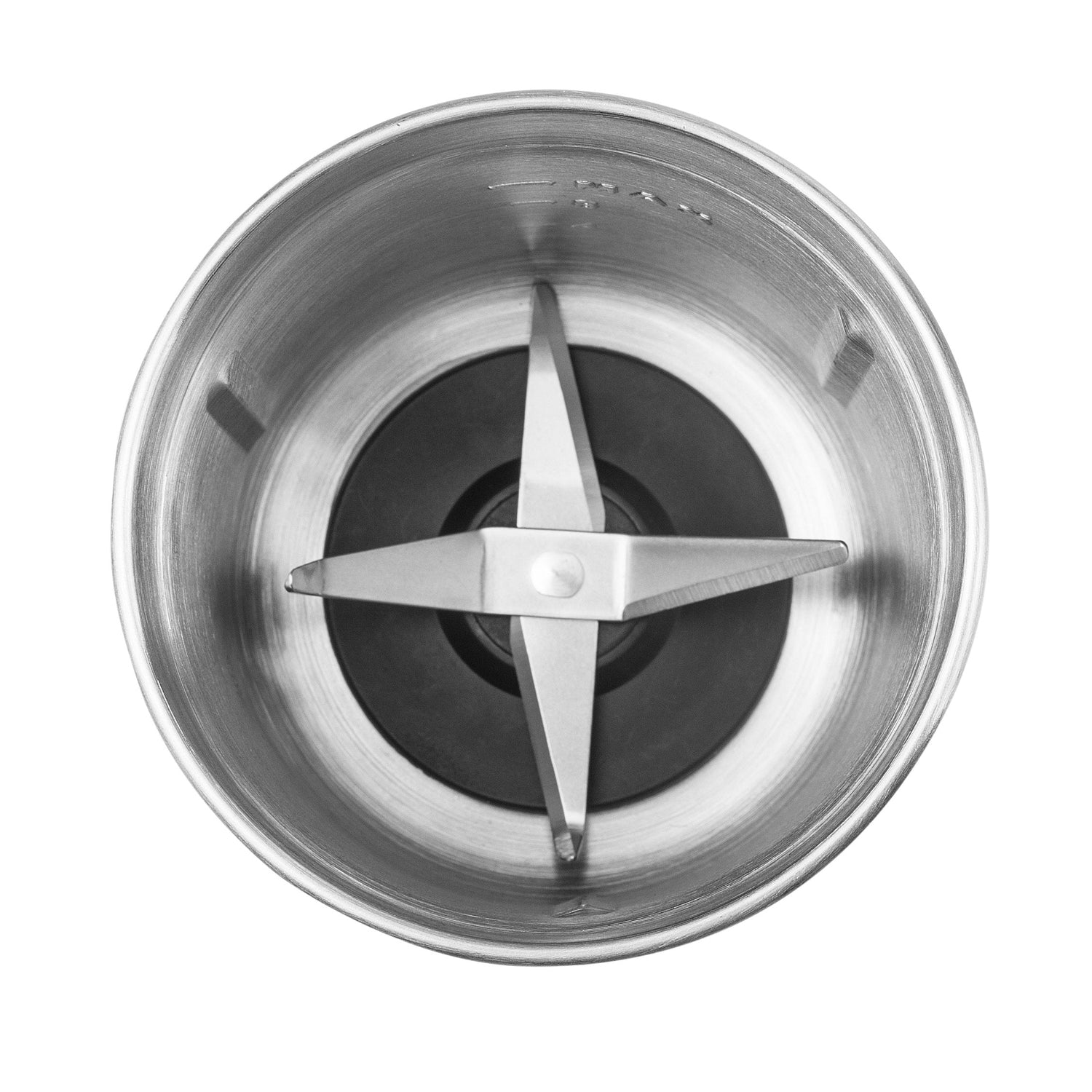 - Dos recipientes extraíbles en acero inoxidable: uno para picar ajo y hierbas frescas, y otro para moler granos de café y especias.