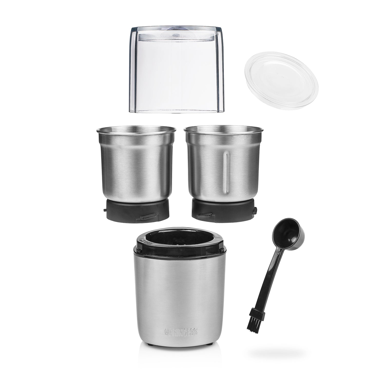 La multipicadora y molinillo Princess incluye dos recipientes y cuchillas para ingredientes secos y húmedos. Las cuchillas para moler se pueden utilizar con granos de café o especias para conseguir mezclas aromáticas. El recipiente para picar cuenta con cuatro cuchillas que pican finamente o a trozos más grandes (según el tiempo durante el que esté la picadora en funcionamiento) ajo, verduras y hierbas frescas. Ideal para preparar pesto, aceite con hierbas y pasta de curry caseros.