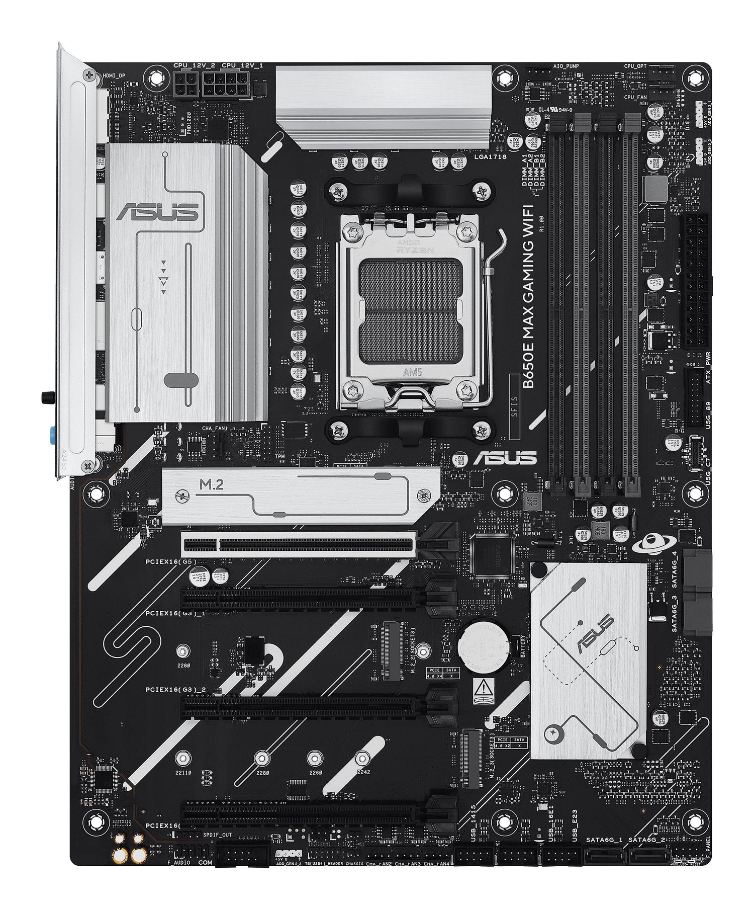 ASUS B650E MAX GAMING WIFI. Fabricante de procesador: AMD, Socket de procesador: Zócalo AM5, Procesador compatible: AMD Ryzen 7000 Series, AMD Ryzen 8000 Series, AMD Ryzen 9000 Series. tipos de memoria compatibles: DDR5-SDRAM, Memoria interna máxima: 256 GB, Tipo de ranuras de memoria: DIMM. Interfaces de disco de almacenamiento soportados: M.2, PCI Express 5.0, SATA III, Tipos de unidades de almacenamiento admitidas: HDD & SSD, Niveles RAID: 0, 1, 5, 10. Tipo de interfaz ethernet: 2.5 Gigabit Ethernet, Estándar Wi-Fi: Wi-Fi 6E (802.11ax), Wi-Fi estándares: Wi-Fi 6E (802.11ax). Componente para: PC, Factor de forma: ATX, Familia del chipset: AMD