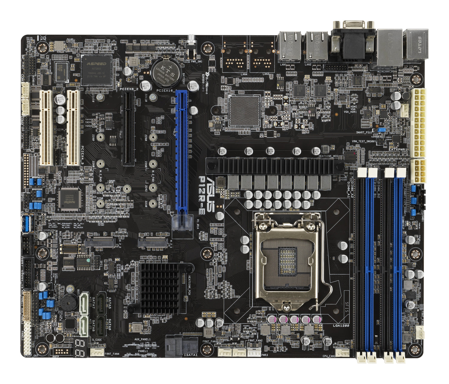ASUS P12R-E. Fabricante de procesador: Intel, Socket de procesador: LGA 1200 (Socket H5), Procesador compatible: Intel® Pentium®, Intel Xeon E. tipos de memoria compatibles: DDR4-SDRAM, Memoria interna máxima: 128 GB, Tipo de ranuras de memoria: DIMM. Interfaces de disco de almacenamiento soportados: M.2, SATA III, Tipos de unidades de almacenamiento admitidas: HDD & SSD. Graphics chipset: ASPEED, Modelo de adaptador gráfico incorporado: Aspeed AST2600, Memoria de adaptador gráfico incorporado: 64 MB. Tipo de interfaz ethernet: Gigabit Ethernet