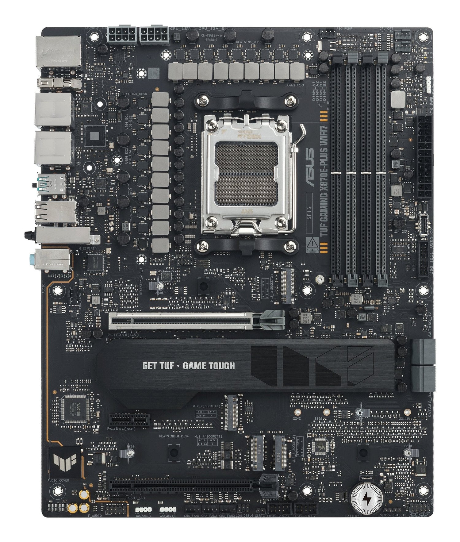 ASUS TUF GAMING X870E-PLUS WIFI7. Fabricante de procesador: AMD, Socket de procesador: Zócalo AM5, Procesador compatible: AMD Ryzen 7000 Series, AMD Ryzen 8000 Series, AMD Ryzen 9000 Series. tipos de memoria compatibles: DDR5-SDRAM, Memoria interna máxima: 256 GB, Tipo de ranuras de memoria: DIMM. Interfaces de disco de almacenamiento soportados: M.2, PCI Express 4.0, PCI Express 5.0, SATA III, Tipos de unidades de almacenamiento admitidas: HDD & SSD, Niveles RAID: 0, 1, 5, 10. Tipo de interfaz ethernet: 2.5 Gigabit Ethernet, Estándar Wi-Fi: Wi-Fi 7 (802.11be), Wi-Fi estándares: Wi-Fi 7 (802.11be). Componente para: PC, Factor de forma: ATX, Familia del chipset: AMD
