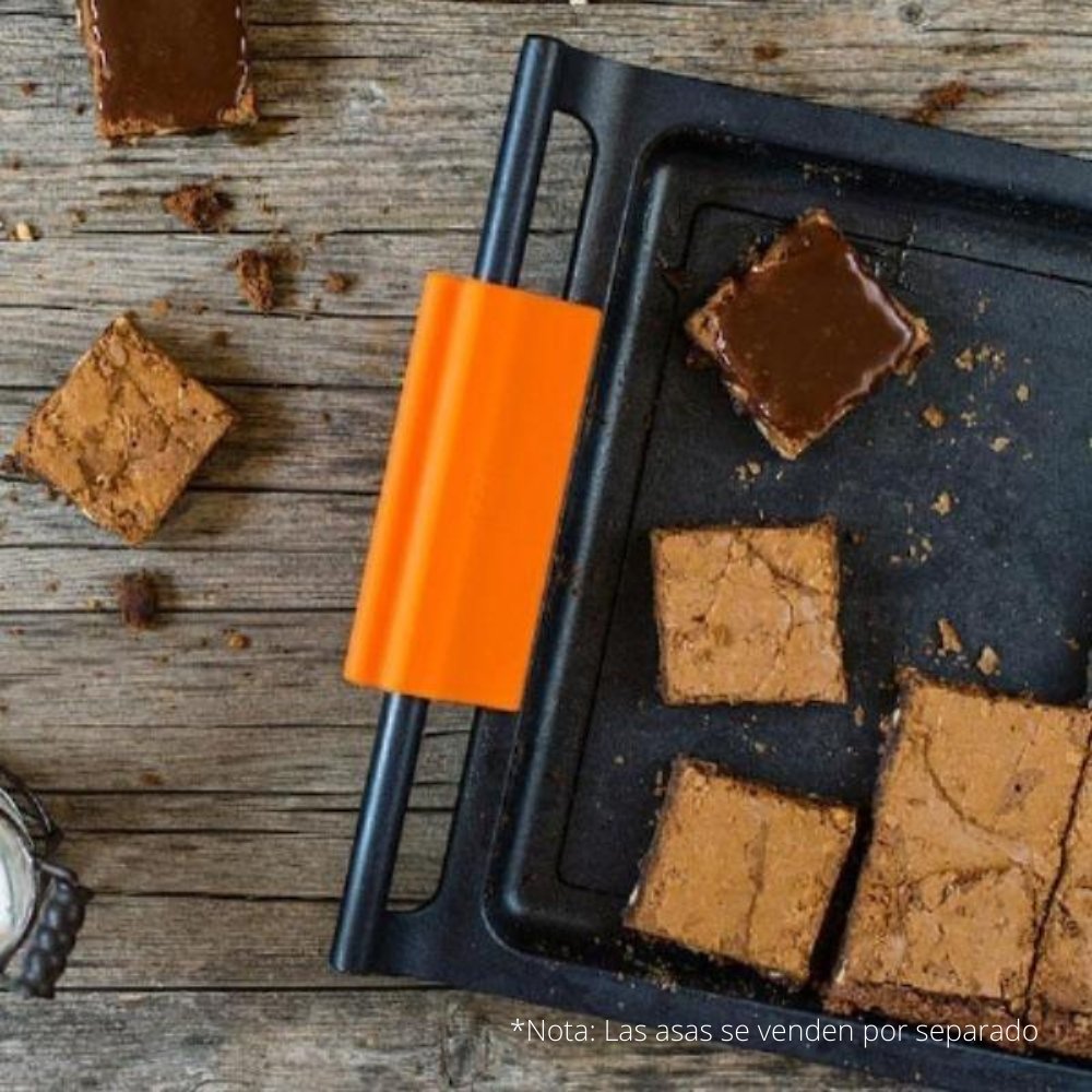 La parrilla lisa Efficient es ideal para cocinar los alimentos, tanto en el fuego como en el horno, de una forma muy sana y sencilla. Su amplio fondo difusor es perfecto para poder cocinar a la vez tanto la carne o el pescado como la guarnición con la que se quiera acompañar. De forma rápida, sin apenas grasas y sin que se pegue nada, podrás preparar unas comidas y cenas de lo más deliciosas. Pincelando la parrilla con el aceite habitual o bien con uno aromatizado, podrás darle un punto diferente a la carne o al pescado en cada ocasión. Platos sabrosos y saludables con un toque especial como unas rodajas de merluza con unos espárragos verdes y un poco de aceite de gambas, un entrecot de ternera con las setas que prefieras y aceite de trufa o de boletus, una parrillada de verduras variadas con aceite de ajo, unos calamares con unas láminas de calabacín con aceite de oliva o unos mejillones abiertos en el grill con un poco de pimienta. Su superficie lisa te permite utilizarlo incluso como bandeja para hornear tartas de hojaldre, galletas, pizzas, empanadas o una focaccia de lo más apetitosa. Recetas sanas y deliciosas en una parrilla muy versátil, robusta y duradera con la que podrás cocinar de forma eficiente y que además se limpia muy fácilmente.
