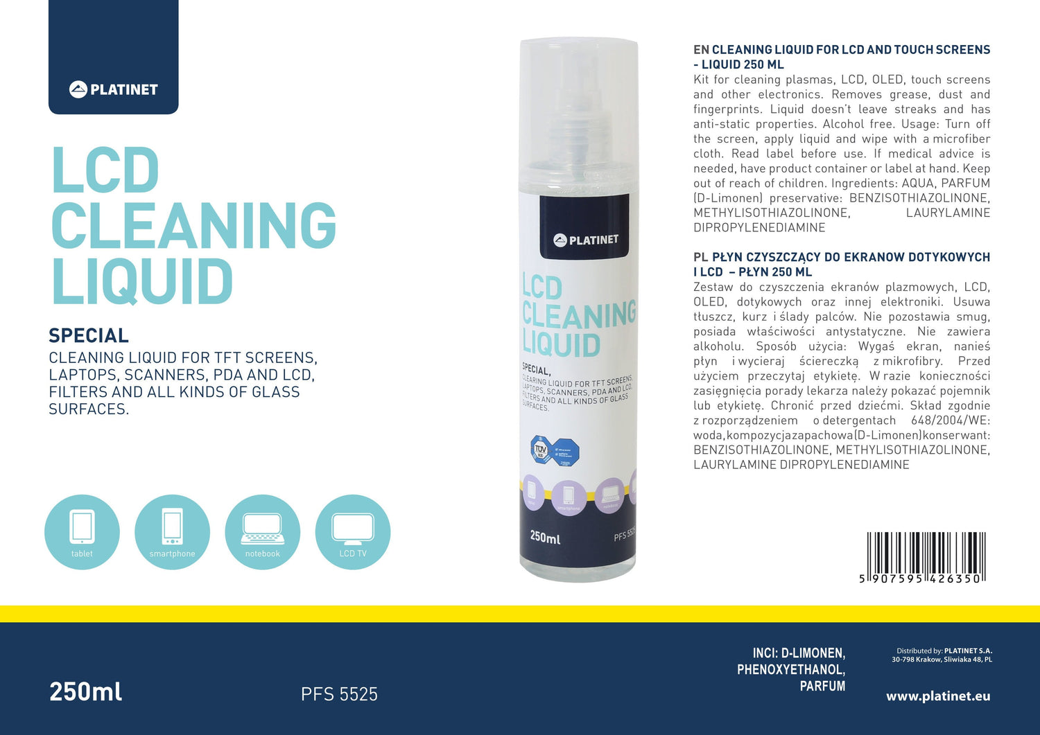 Platinet PFS5525, Espray para limpieza de equipos, LCD/TFT/Plasma, Pantallas / Plásticos, 250 ml, 1 pieza(s)