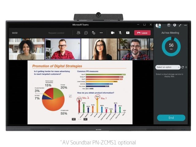 Sharp PN-L862B. Diagonal de la pantalla: 2,18 m (86"), Brillo de pantalla: 350 cd / m², Resolución de la pantalla: 3840 x 2160 Pixeles. Sistema operativo instalado: Android, Arquitectura del procesador: ARM Cortex-A73, Memoria del usuario: 32 GB. Potencia de altavoz: 20 W. Estándar Wi-Fi: Wi-Fi 5 (802.11ac), Wi-Fi estándares: 802.11a, 802.11b, 802.11g, Wi-Fi 4 (802.11n), Wi-Fi 5 (802.11ac), Ethernet LAN, velocidad de transferencia de datos: 10,100 Mbit/s. Auriculares: 3,5 mm