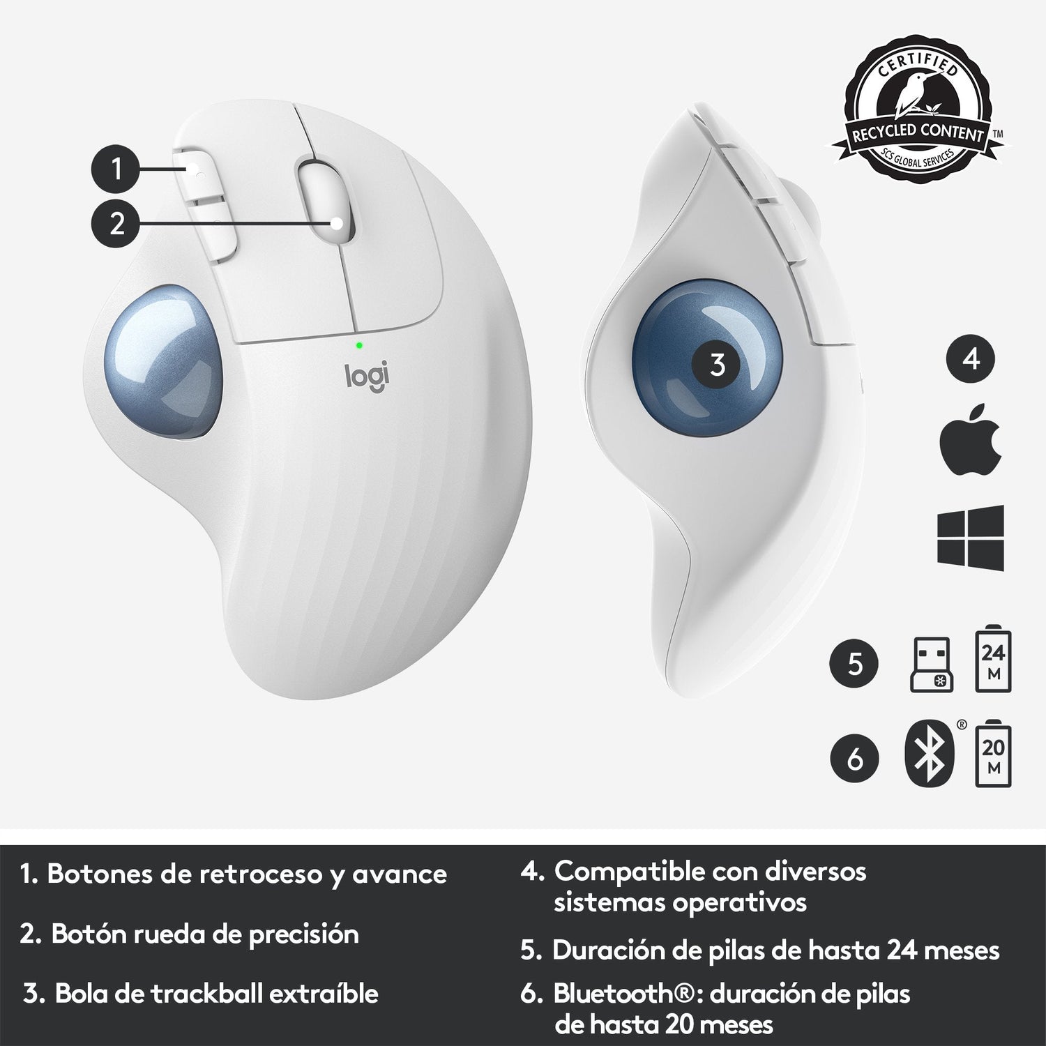 Logitech ERGO M575. Factor de forma: mano derecha. Tecnología de detección de movimientos: Trackball, Interfaz del dispositivo: RF Wireless + Bluetooth, Resolución de movimiento: 2000 DPI, Tipo de botones: Botones presionados, Cantidad de botones: 5, Tipo de desplazamiento: Rueda. Fuente de energía: Baterías. Color del producto: Blanco