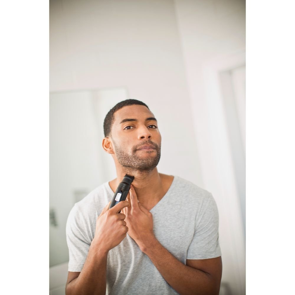 Sean cuales sean tus necesidades, con este aparato multifunción tendrás todos los flancos cubiertos. Elige el accesorio que necesites en cada momento: el recortador principal, que cuenta con cinco peines fijos de distintas longitudes (1, 5, 3, 6, 9 y 12 mm), el cortador lineal facial, la miniafeitadora de láminas o el cortador de precisión. Además, todos los accesorios de corte se guardan cómodamente en la base de almacenamiento, compacta, estilizada y con función de carga, listos para la próxima vez.