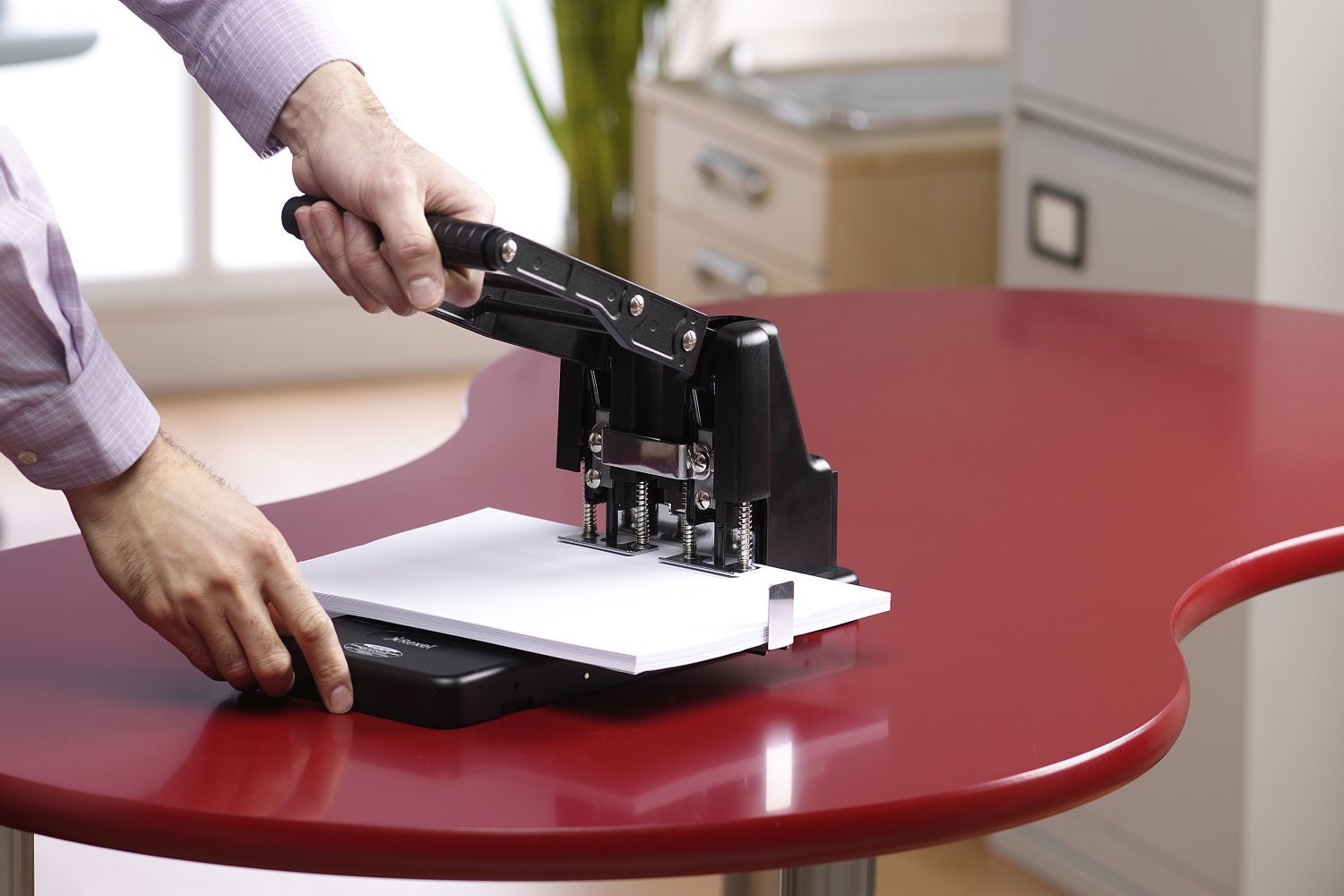 Si busca una perforadora de 2 agujeros de uso intensivo que pueda cortar con facilidad agujeros de 6 mm Ø a 8 cm entre sí a través de 300 hojas, pruebe la Rexel HD2300. Esta potente máquina incorpora la tecnología de punzones huecos para una perforación sin esfuerzo mientras que la profundidad del papel ajustable y las guías metálicas de papel garantizan una precisión total.