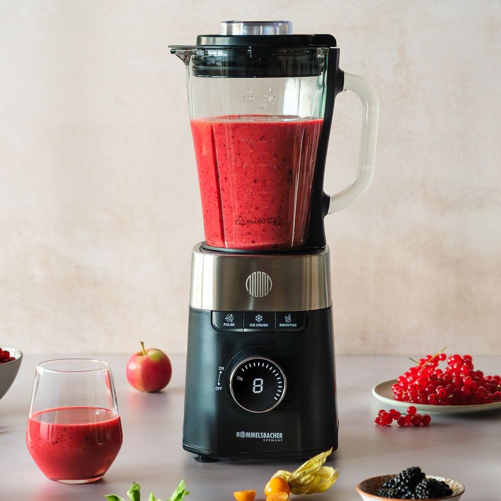 Rommelsbacher MX 1260, Batidora de vaso, Función de impulso, Picahielos, 1200 W, Negro, Acero inoxidable, Transparente