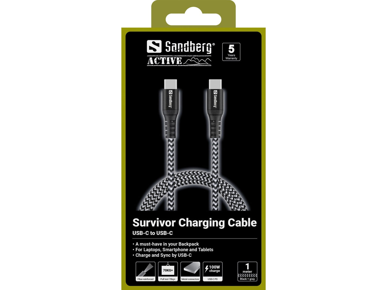 Sandberg Survivor USB-C- USB-C Cable 1M. Longitud de cable: 1 m. Conector 1: USB C, Conector 2: USB C, Versión USB: USB 2.0, Color del producto: Negro, Gris