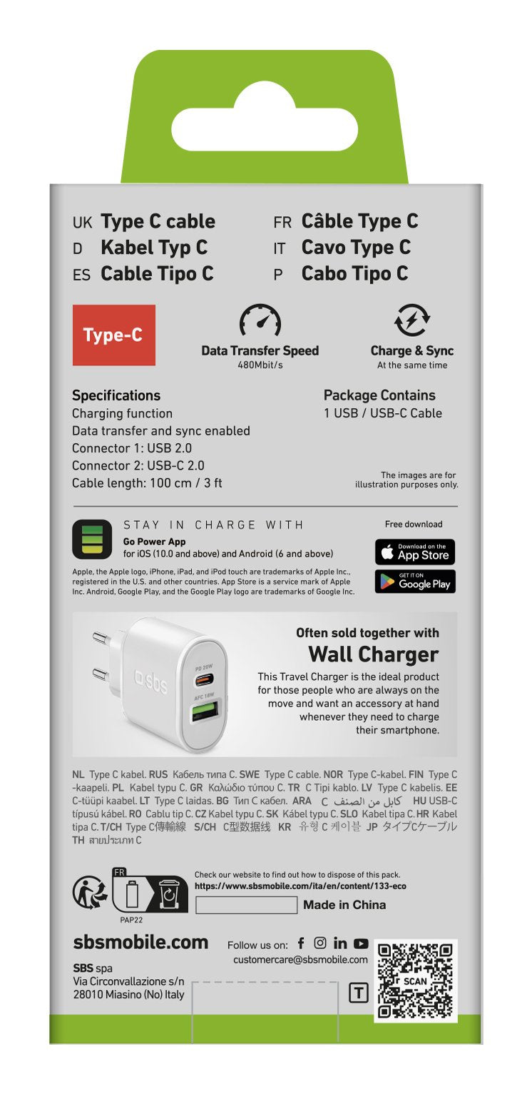 SBS TECABLEMICROC10W, 1 m, USB A, USB C, USB 2.0, 0,48 Gbit/s, Blanco
