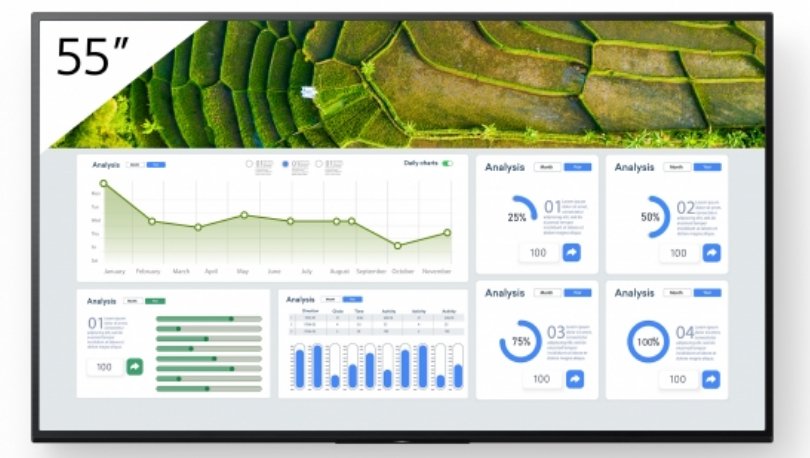 Sony FW-55BZ30L/TM. Diseño de producto: Pantalla plana para señalización digital. Diagonal de la pantalla: 139,7 cm (55"), Tecnología de visualización: LCD, Resolución de la pantalla: 3840 x 2160 Pixeles, Brillo de pantalla: 440 cd / m², Tipo HD: 4K Ultra HD. Wifi. Horas de funcionamiento (horas/días): 24/7. Sistema operativo instalado: Android. Color del producto: Negro