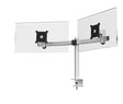 El soporte de monitor consiste en una columna para la mesa, una abrazadera en cruz y 2 soportes VESA deslizantes y rotatorios para monitores