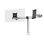 El soporte de monitor consiste en una columna para la mesa, una abrazadera en cruz y 2 soportes VESA deslizantes y rotatorios para monitor y tableta
