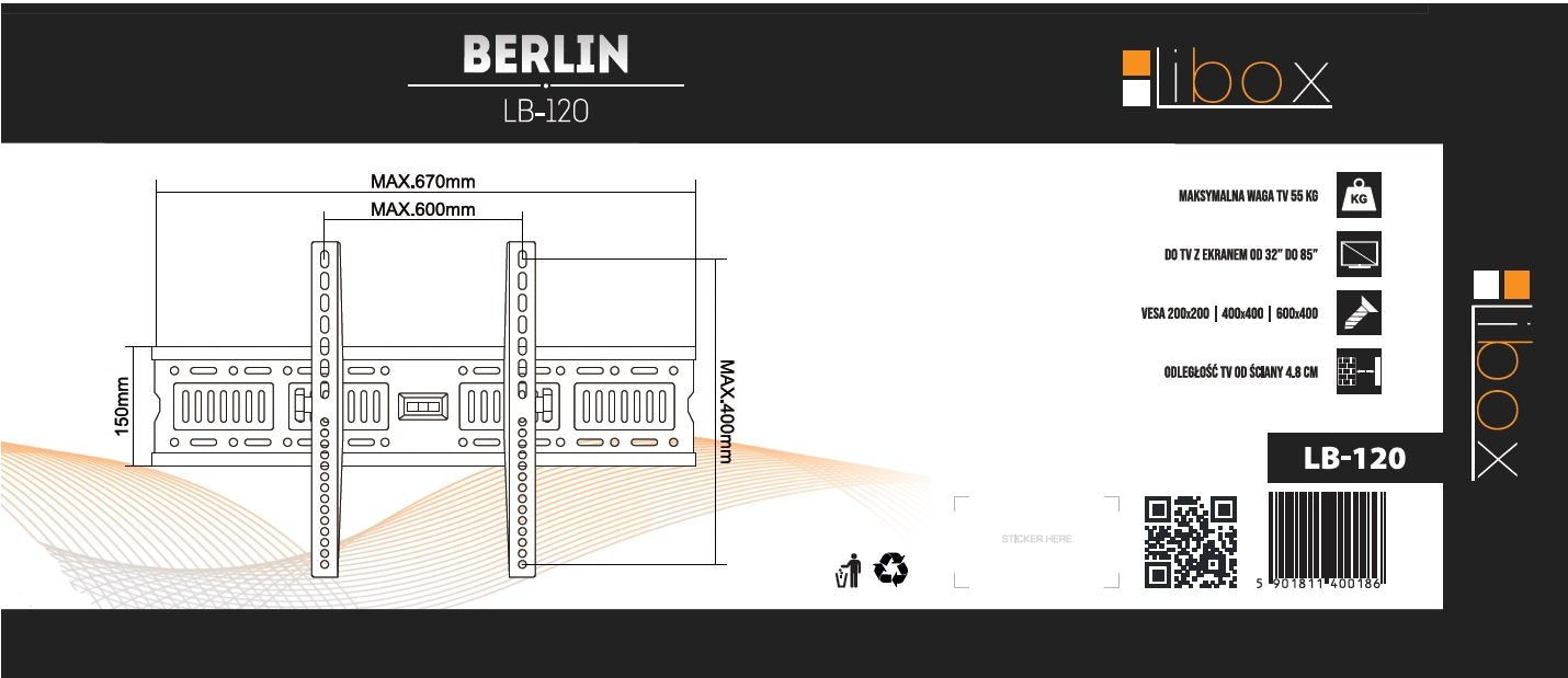 Libox LB-120. Capacidad máxima de peso: 55 kg, Tamaño mínimo de pantalla: 81,3 cm (32"), Tamaño máximo de pantalla: 2,16 m (85"), Compatibilidad con interfaz de montaje (min): 200 x 200 mm, Compatibilidad con interfaz de montaje (max): 600 x 400 mm. Color del producto: Negro