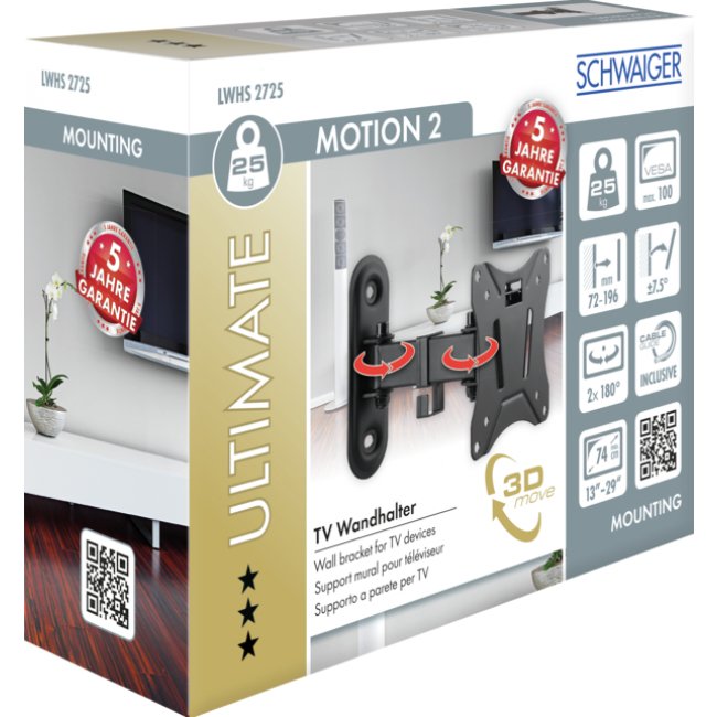 Schwaiger MOTION 2. Capacidad máxima de peso: 25 kg, Tamaño mínimo de pantalla: 33 cm (13"), Tamaño máximo de pantalla: 73,7 cm (29"), Compatibilidad con interfaz de montaje (min): 75 x 75 mm, Compatibilidad con interfaz de montaje (max): 100 x 100 mm. Ángulo de inclinación: -7,5 - 7,5°, Distancia a la pared (min): 7,2 cm, Distancia a la pared (max): 19,6 cm. Color del producto: Negro