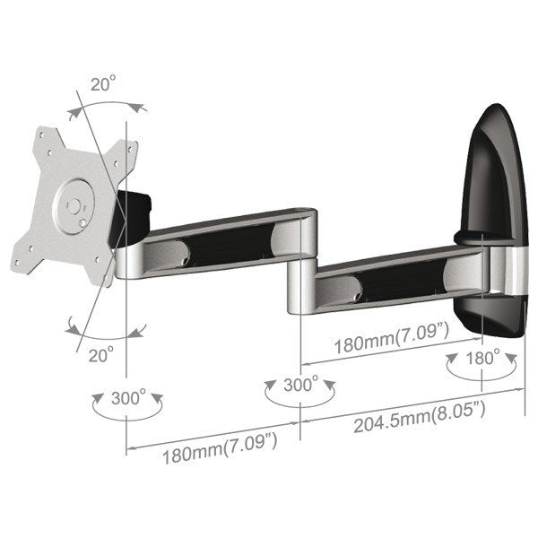 Tronje AR210. Capacidad máxima de peso: 12 kg, Tamaño mínimo de pantalla: 38,1 cm (15"), Tamaño máximo de pantalla: 61 cm (24"), Compatibilidad con interfaz de montaje (min): 75 x 75 mm, Compatibilidad con interfaz de montaje (max): 100 x 100 mm. Ángulo de inclinación: 0 - 20°, Ángulo de giro (alcance): 0 - 180°, Distancia a la pared (min): 8,5 cm, Distancia a la pared (max): 44,5 cm