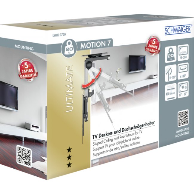 Schwaiger LWHD3720 513. Capacidad máxima de peso: 20 kg, Tamaño mínimo de pantalla: 43,2 cm (17"), Tamaño máximo de pantalla: 94 cm (37"), Compatibilidad con interfaz de montaje (min): 75 x 75 mm, Compatibilidad con interfaz de montaje (max): 200 x 200 mm. Ángulo de inclinación: 0 - 120°, Ángulo de giro (alcance): 90 - -90°. Color del producto: Negro