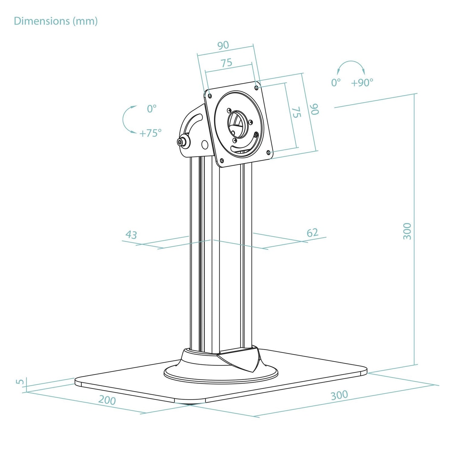 Soporte de mesa para marcos antirrobo, con un una rotación de 90° y un ángulo de inclinación de hasta 75°. Sistema de ocultación de cables.