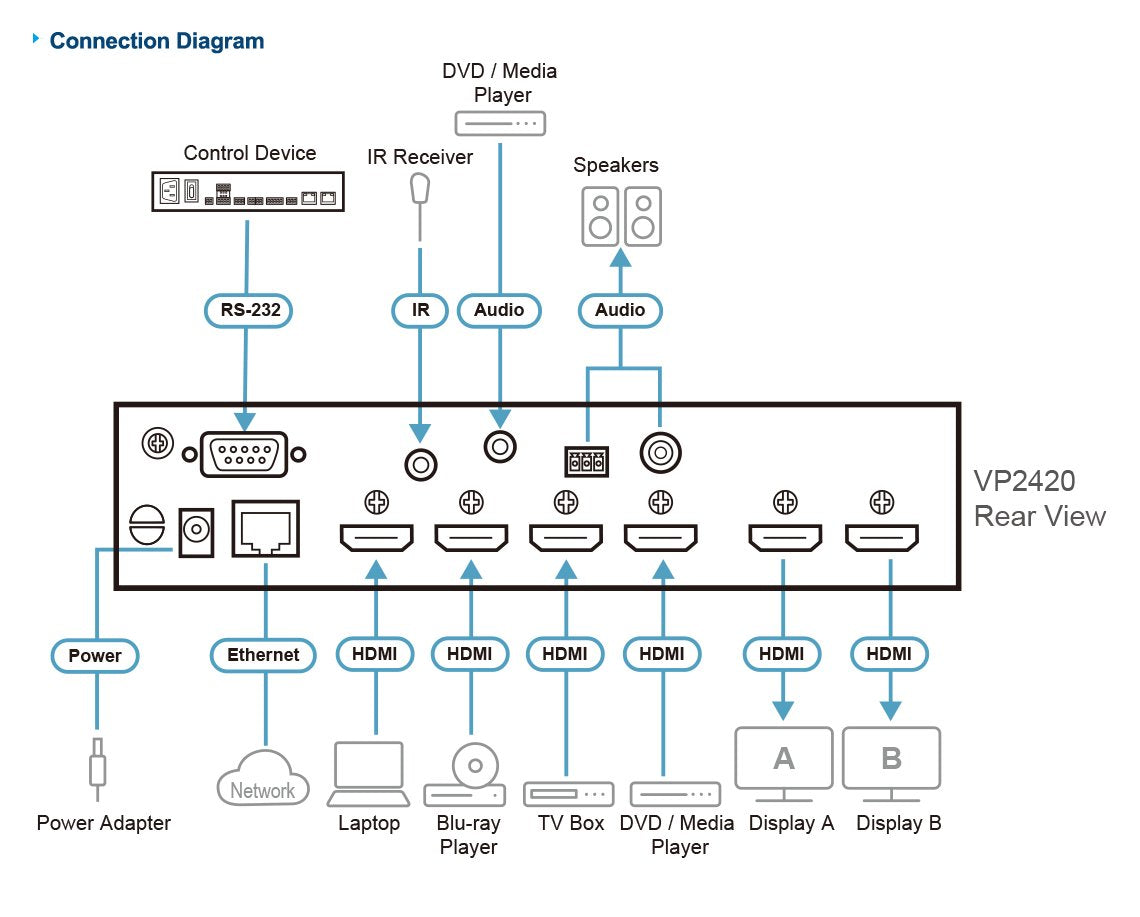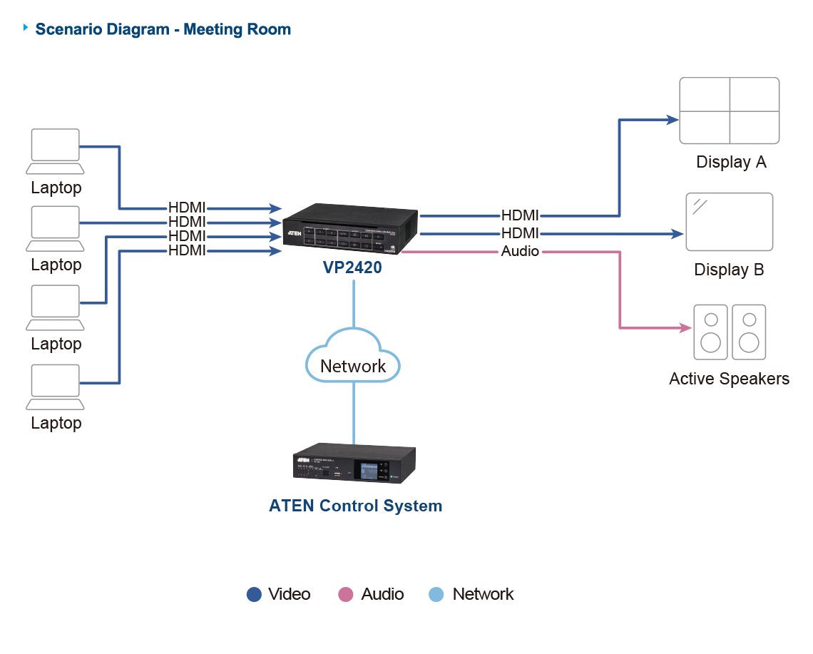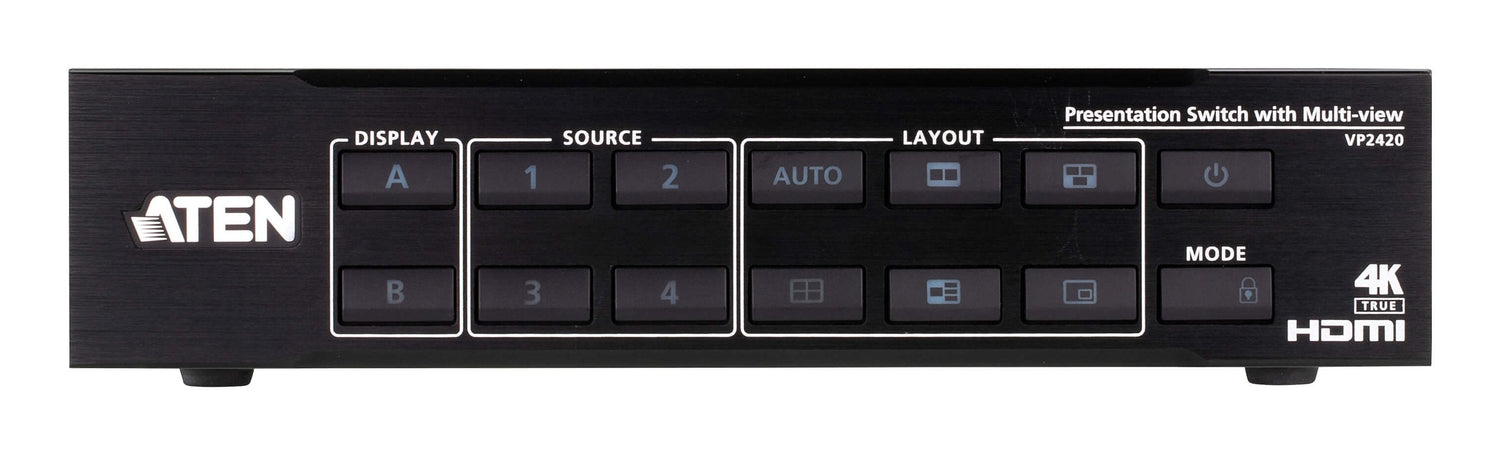ATEN VP2420. Tipo de producto: Matriz de conmutación de presentación multimedia, Máxima resolución: 4096 x 2160 Pixeles, Resolución máxima (HDMI): 4096 x 2160 Pixeles. Color de la carcasa: Negro, Material de la carcasa: Metal, Tipo de control: Botones. Consumo energético: 17,1 W. Ancho: 160,5 mm, Profundidad: 200 mm, Altura: 44 mm