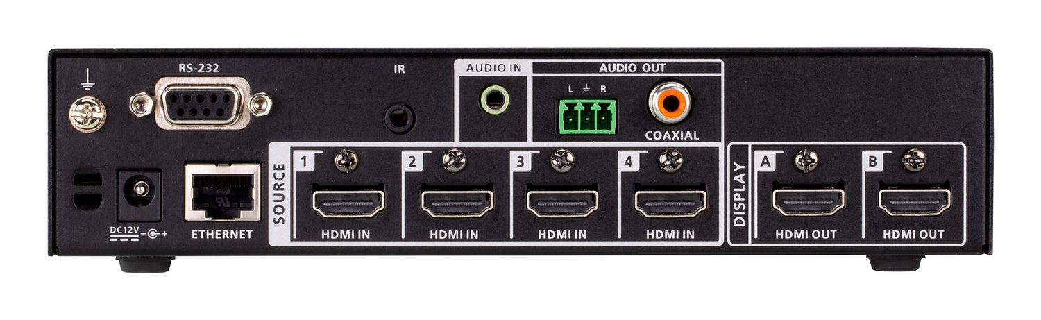 - Cantidad de puertos de entrada HDMI: 4 Cantidad de puertos de salida HDMI: 2 Puertos de entrada RJ-45: 1 Enchufe de entrada de CC