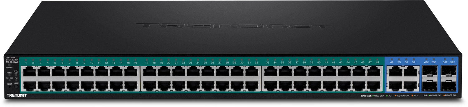El switch Gigabit Web Smart PoE+ de 52 puertos de TRENDnet, modelo TPE-5048WS, ofrece una funcionalidad de administración avanzada con capacidad de conmutación de 104Gbps. Este switch con opción de montaje en bastidor y compatible con IPv6 viene con una intuitiva interfaz basada en la web. Sus controles de administración avanzada del tráfico, resolución de problemas y monitorización SNMP lo convierten en una potente solución para redes de PyMES. El TPE-5048WS ofrece 48 puertos gigabit PoE+ con una potencia total disponible de 740W y cuatro puertos gigabit (RJ-45 o SFP). La norma PoE+ suministra hasta 30W de potencia por puerto para dispositivos como puntos de acceso wireless de alta potencia, cámaras de Internet con PTZ (movimiento vertical-horizontal y zoom), y sistemas de telefonía VoIP.