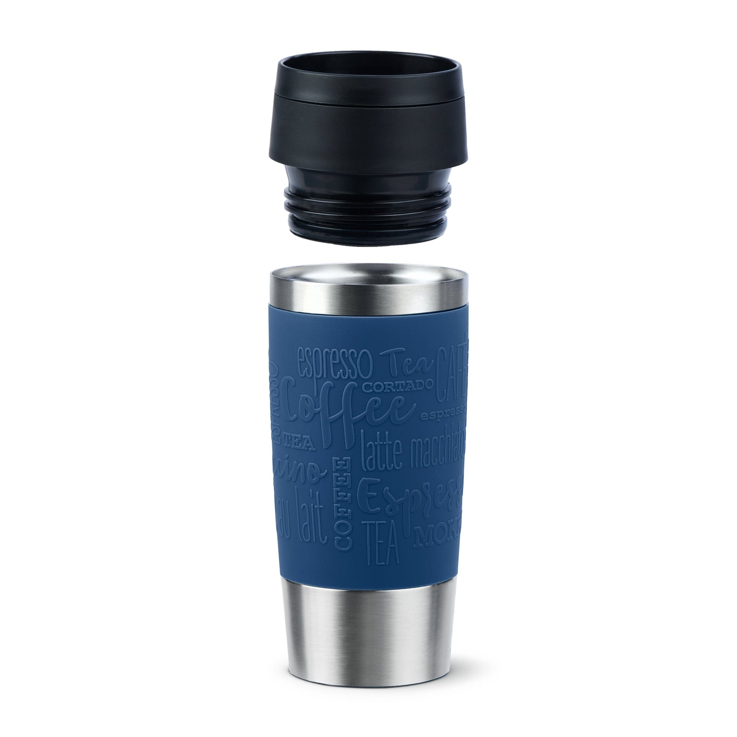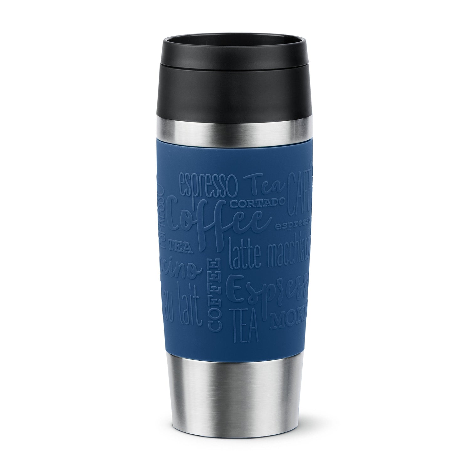 EMSA Travel Mug Classic N2020300. Color del producto: Negro, Azul, Acero inoxidable, Material de la cubierta: Silicona, Material interior: Acero inoxidable. Volumen: 360 ml, Diámetro: 8,2 cm, Ancho: 82 mm. Ancho del paquete: 80 mm, Profundidad del paquete: 80 mm, Altura del paquete: 204 mm. Cantidad por capa de palet: 96 pieza(s), Cantidad por palé: 480 pieza(s), Cantidad por contenedor (20ft): 18196 pieza(s)