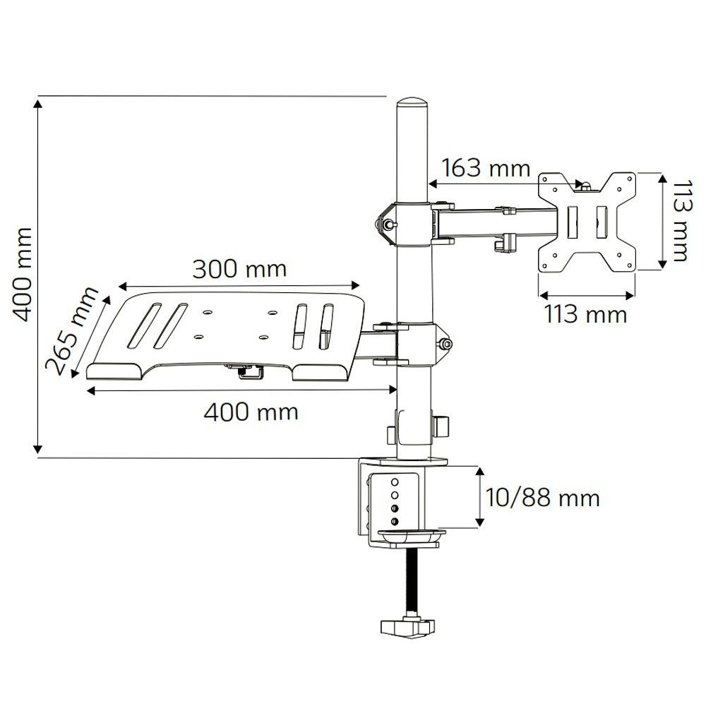 Techly ICA-LCD 174NB. Montaje: Abrazadera, Capacidad máxima de peso: 16 kg, Tamaño mínimo de pantalla: 33 cm (13"), Tamaño máximo de pantalla: 81,3 cm (32"), Compatibilidad con interfaz de montaje (min): 75 x 75 mm, Compatibilidad con interfaz de montaje (max): 100 x 100 mm. Ajustes de altura, Ángulo de inclinación: -45 - 45°. Color del producto: Negro