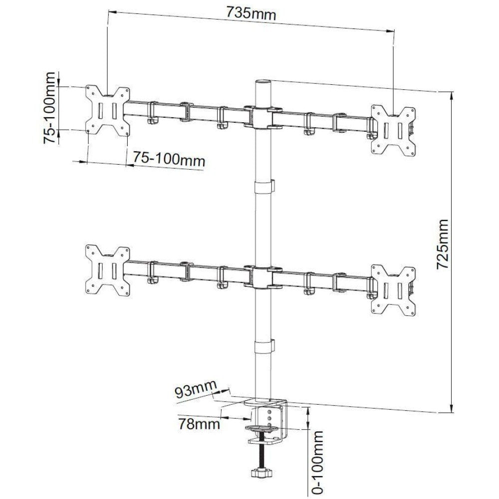 Techly ICA-LCD 382-Q. Montaje: Abrazadera, Capacidad máxima de peso: 40 kg, Tamaño mínimo de pantalla: 33 cm (13"), Tamaño máximo de pantalla: 68,6 cm (27"), Compatibilidad con interfaz de montaje (min): 75 x 75 mm, Compatibilidad con interfaz de montaje (max): 100 x 100 mm. Ajustes de altura, Ángulo de inclinación: -15 - 15°. Color del producto: Negro