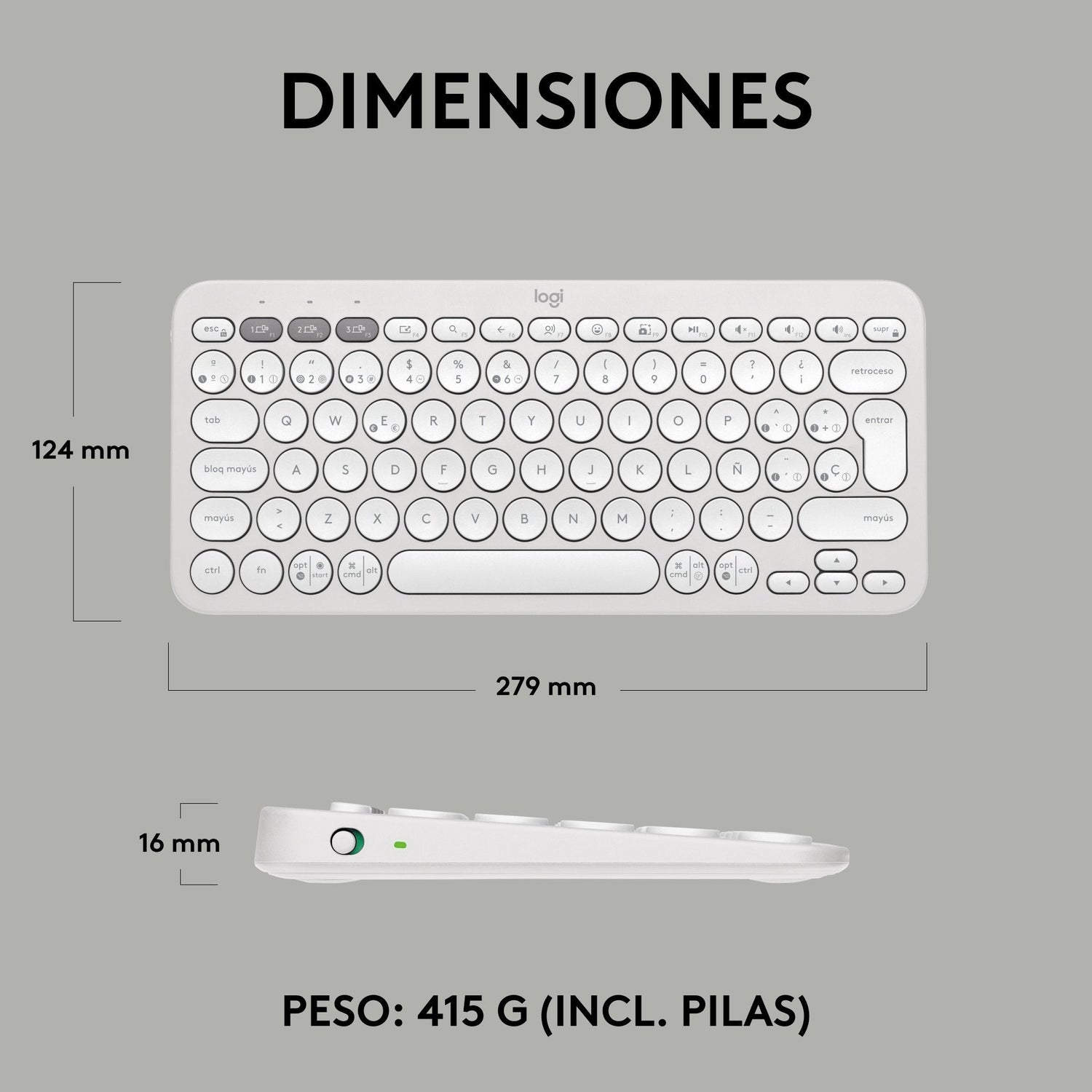 Logitech Pebble Keys 2 K380s. Formato del teclado: Mini. Estilo de teclado: Derecho. Tecnología de conectividad: Inalámbrico, Interfaz del dispositivo: RF Wireless + Bluetooth, Interruptor del teclado: Switch de tecla de tijera, Diseño de teclado: QWERTY, Uso recomendado: Universal. Color del producto: Blanco