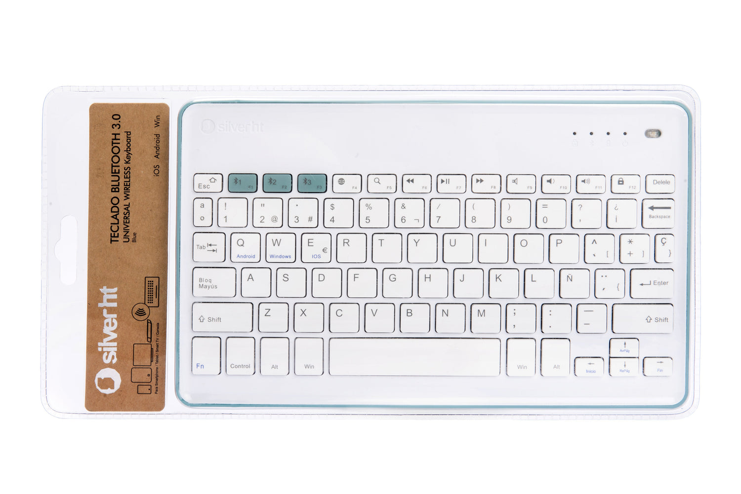 SilverHT Wireless KB White + Blue. Idioma del teclado: Español. Marca compatible: Cualquier marca, Compatibilidad: Universal, Color del producto: Azul, Blanco. Tecnología de conectividad: Inalámbrico, Interfaz del dispositivo: Bluetooth, Versión de Bluetooth: 3.0+EDR. Fuente de energía: Batería, Tipo de batería: Batería integrada, Tecnología de batería: Litio. Sistemas operativos móviles soportados: Android, iOS 10.0, Sistema operativo Windows soportado: Windows 10, Windows 7, Windows 8