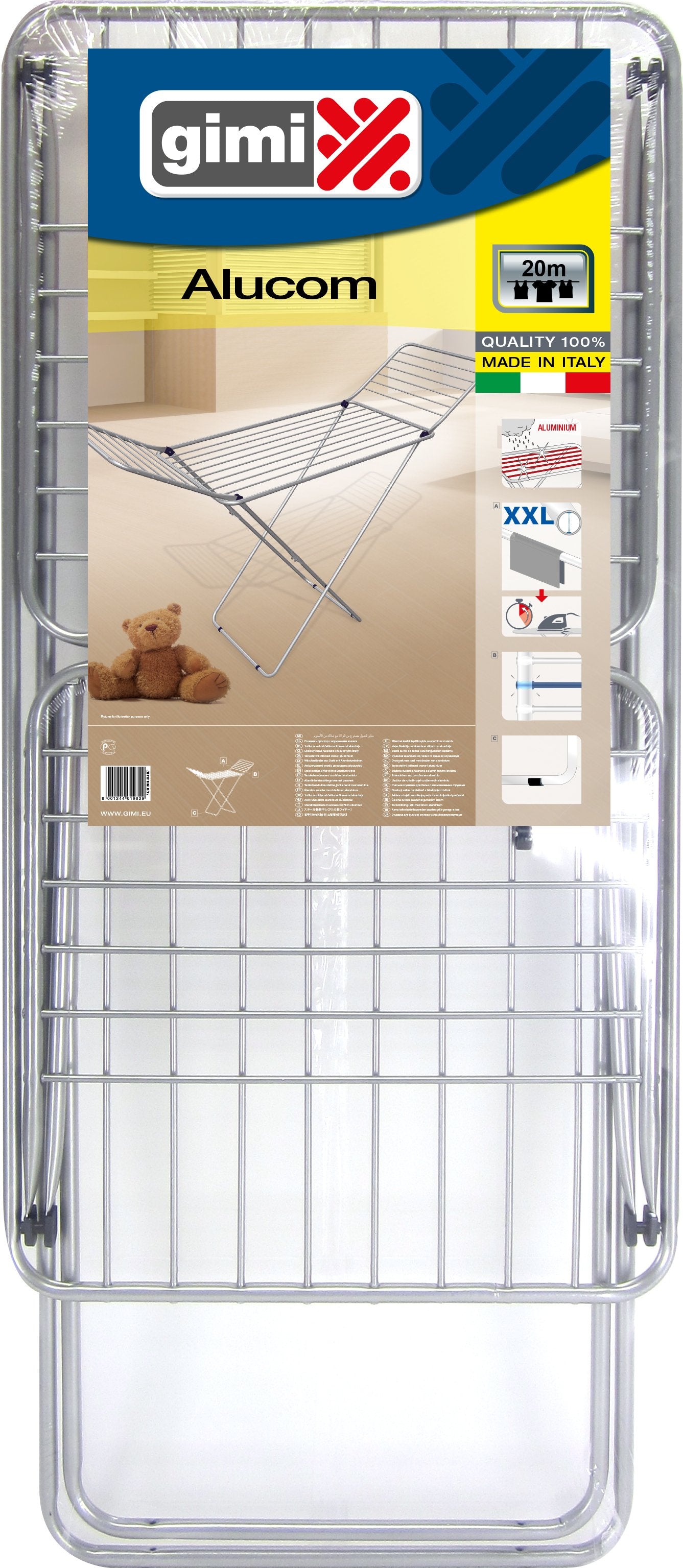 Gimi Alucom. Tipo: Tendedero de ropa, Material: Aluminio, Acero, Color del producto: Plata. Ancho: 1715 mm, Profundidad: 555 mm, Altura: 930 mm. Cantidad por paquete: 1 pieza(s)
