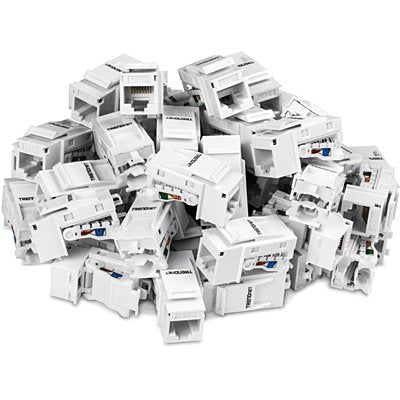 Jack Keystone Cat6 de TRENDnet - pack de 50 jacks, modelo TC-K50C6, incluye cincuenta conectores jack Keystone Cat6 para usar con el panel de conexión Keystone en blanco TC-KP24 de TRENDnet. Cada jack Keystone proporciona velocidades de hasta 10Gbps a lo largo de más de 55m (180 pies) de cableado Cat6 Ethernet. Estos jacks Keystone Cat6 cuentan con un conveniente diseño sin herramientas, con separación de cables para facilitar el manejo de sus extremos.