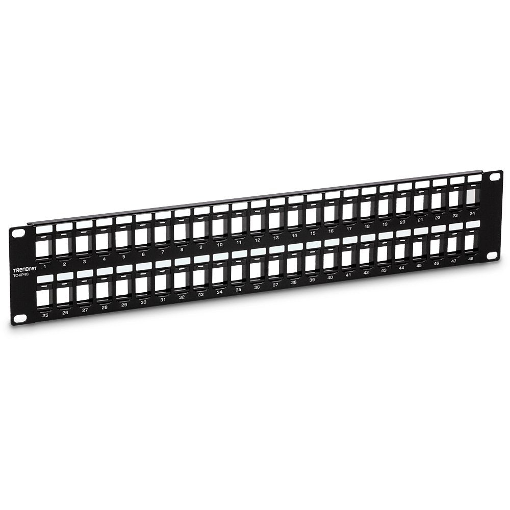 El panel de conexión 2U de 48 puertos en blanco de TRENDnet, modelo TC-KP48, está diseñado para utilizarse con los conectores keystone Cat6 de TRENDnet (TC-K25C6 y TC-K50C6). Cuando se utilizan juntos, generan una solución de panel de conexión keystone HD adaptada para aplicaciones de red Gigabit de alta velocidad.