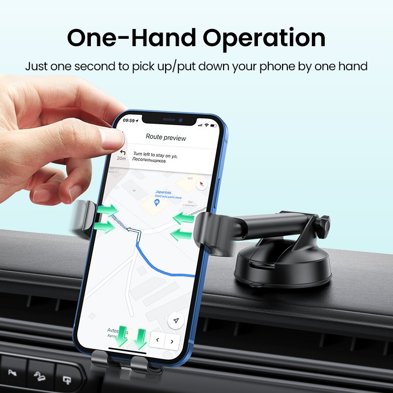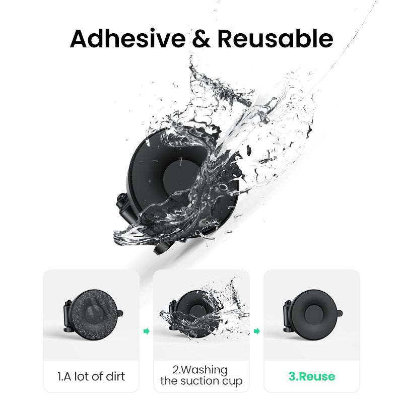 .Soporte más seguro y estable: el soporte para teléfono para automóvil mejorado de UGREEN está equipado con una ventosa agrandada, una almohadilla de gel adhesiva más fuerte y un botón de bloqueo al vacío. El mecanismo de triple bloqueo le brinda de manera efectiva un agarre más resistente y estable al parabrisas, tablero u otras superficies lisas del automóvil, sin preocuparse por caídas incluso en caminos con baches.